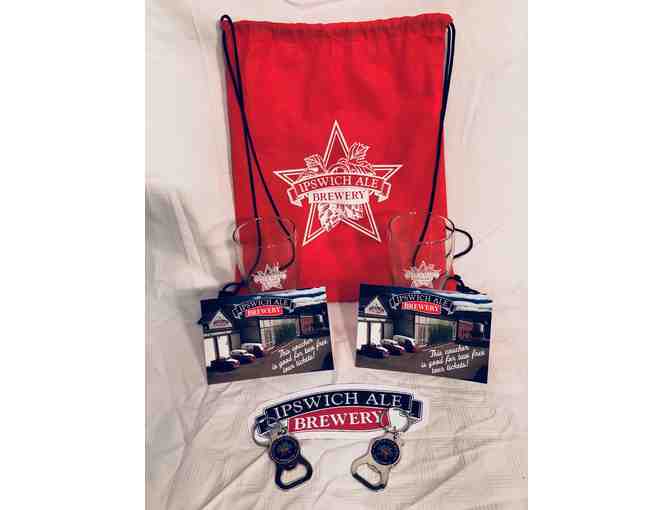 The winning bidder also receives a bright red tote bag full of logo items: two pint glasses, two key chains, and stickers.