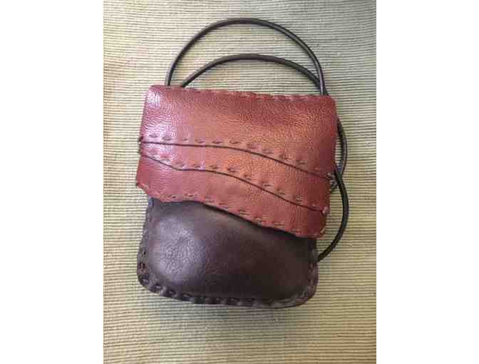 You are bidding on a hand crafted, hand sewn leather bag by Vernell Jordan, Unique Designs in Leather. The bag is 6 1/4" x 6 1/2" with sculpted leather detail and back snap closure. The slender strap is 50 - 58".