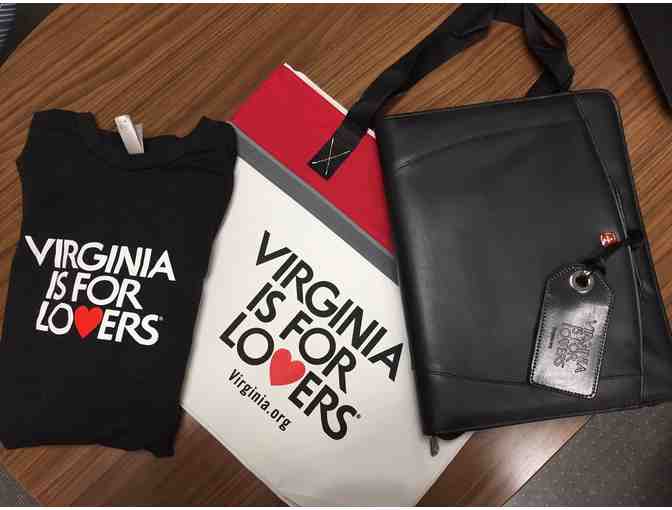 Zippered canvas tote with Wenger Swiss Army Leather Portfolio inside. Portfolio features a 8 1/2 x 11 note pad, detachable three ring binder, pocket for tablet and slide out handles. Virginia is for Lovers large soft t-shirt and leather luggage tag.