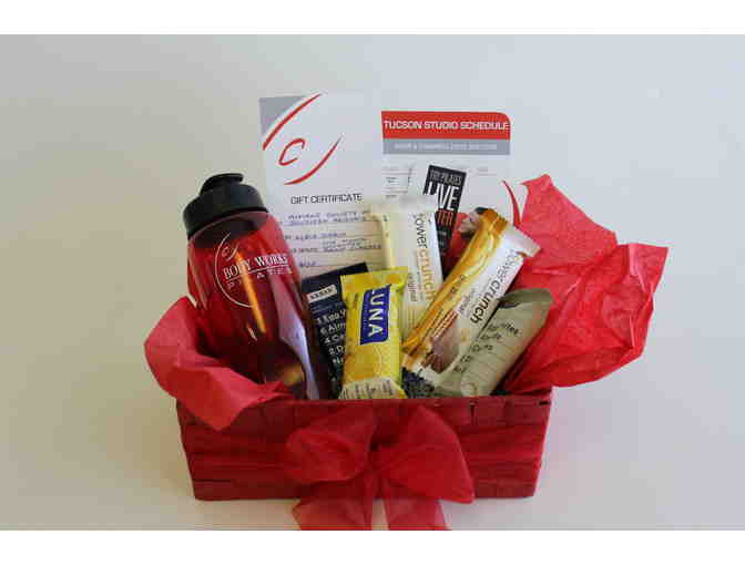 This auction includes a pass for One Month of Unlimited Pilates Classes, a red Body Works Pilates water bottle and a selection of power bars.