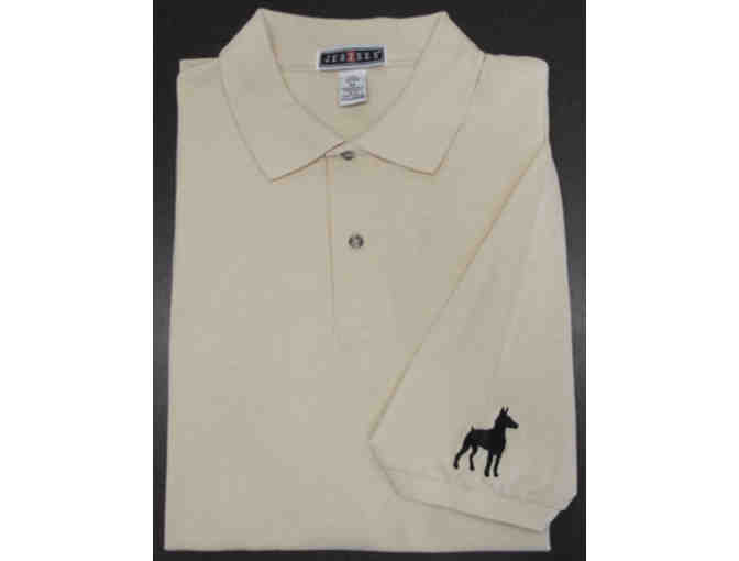 Here's how with a 2" x 1 1/2" embroidered Doberman very close to your heart! This is a Jerzees 100% cotton pique knit polo in a Size L Mens/Unisex in a light sand color - looks like a great shirt for a Dobe Lover or a golf shirt for any Dobe-loving duffer out there!