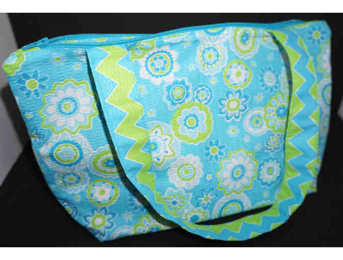 What's even better than stepping out with a super cute and fashionable new handbag? Stepping out with a LOCALLY HANDMADE super cute new handbag! Made by Nein Designs, this beautiful blue, green, and white bag with 1 inner pocket measures 8" tall, 14" across top and 10" bottom.