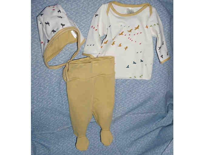 Homemade organic cotton newborn set yellow & birds, footed pants, lap neck T, hat