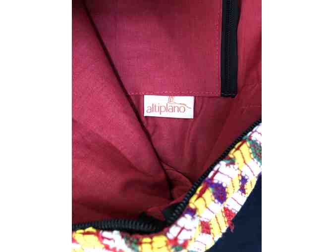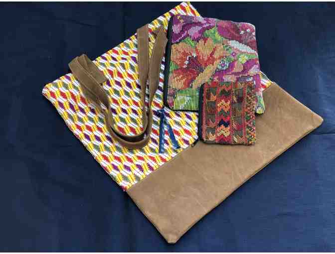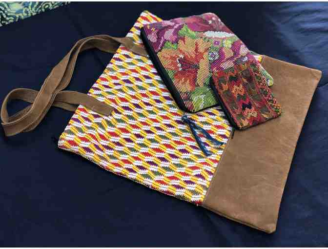 Handwoven textile and suede bag from Guatemala, Fair Trade with two small embroidered bags made from huipiles by the women of Guatemala 15''x17''