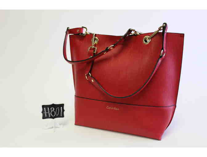 Gorgeous leather handbag that can be worn with the red or black leather showing. Tote style. Calvin Klein. Measures 16" x 13".