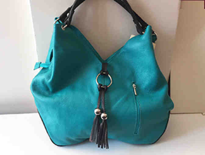Teal leather satchel with contrasting black handles, design on bottom and tassles.