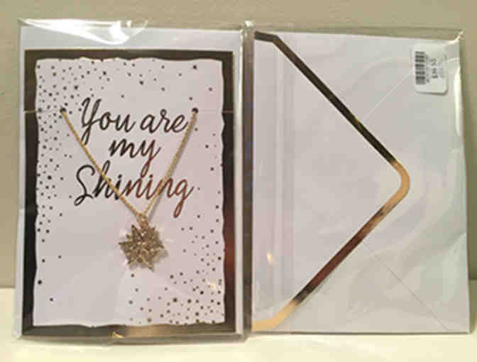 Gold star necklace on a card that reads "You are my Shining," with the star necklace appearing below the words. The star is 0.75 inches in diameter with crystal stones, delicate chain, card and envelope for mailing with gold foil print. Protected in acetate sleeve.