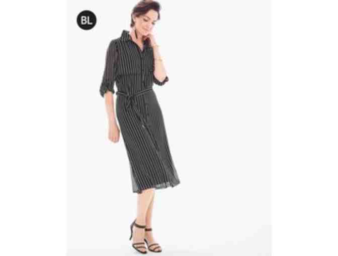 Pinstripe perfection. This breezy button-up shirtdress is the softest way to add edge, with modern touches like a chic bodice overlay, D-ring roll-tab sleeves and a self-fabric belt with silver-tone hardware detail.