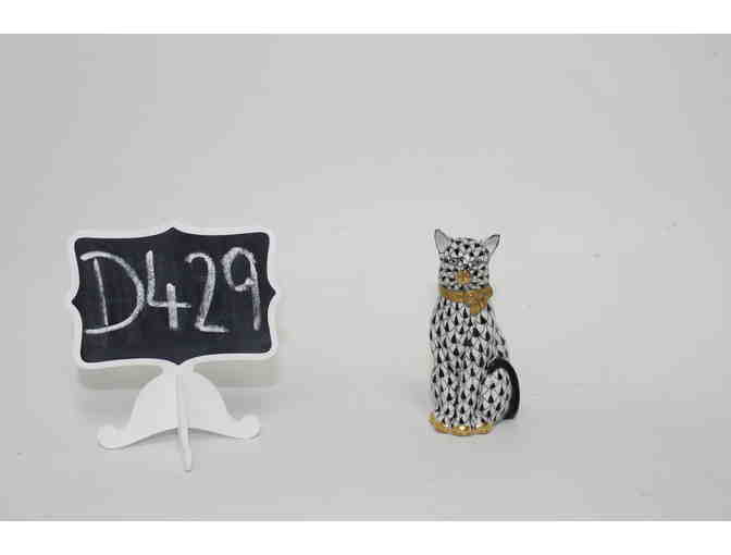 Herend (founded in 1826) “Cat with Bow” hand painted Black Fishnet pattern porcelain cat figurine. Etched with Product Number “HEREND 2280” and identified with Herend’s “First Class Quality” trademark (1949 to Present) “HEREND HUNGARY HANDPAINED 45536-0-00/VH.” 1.5”W x 3.5”H x 1.5”D.