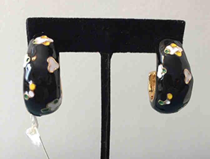 These earrings are inspired by Ciner Enamel Jewelry of the 1970s, which has a cult following among fashionistas. These are C-hoops with a post for pierced ears with, gold, black epoxy, and white trefoil elements in a delicate floral design. 1.25" long.