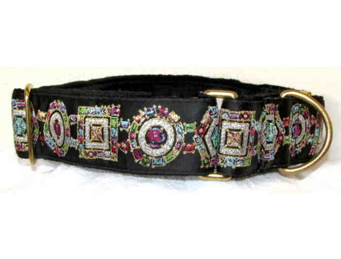 The “Jewels” ribbon is 1 1/2" wide and the Martingale (the gentle loop within a loop tightening collar) measures 1 /5/8” finished width along with solid brass fittings – D-ring and slides. The collars are adjustable to 14" to over 20" neck measurements.