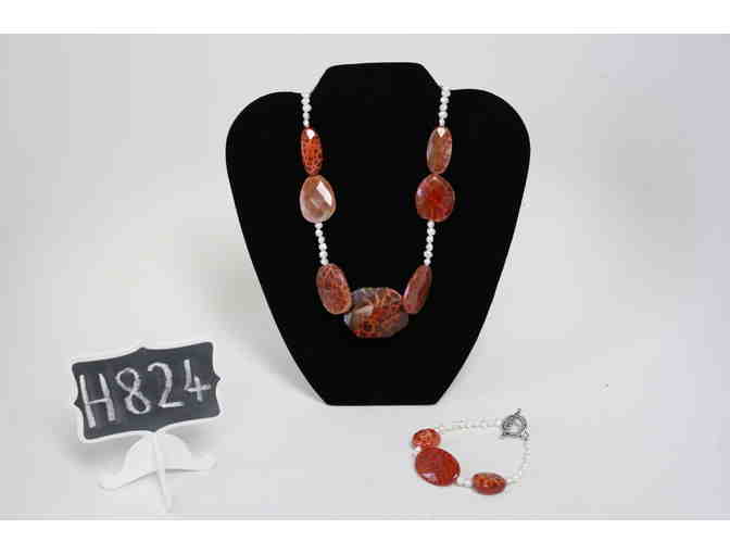 Fire Crackle Agate Gemstone Necklace with Fresh Water Pearls and Matching Bracelet