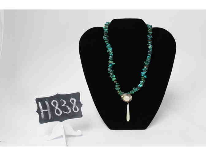 Turquoise necklace with silver and mother of pearl dangle pendant and silver-tone clasp.