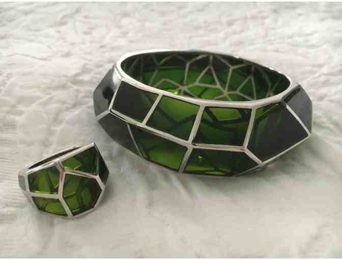This contemporary De lann bracelet with matching ring is sure to dress up your wardrobe. With rhodium plated and premium epoxy resin in peridot.