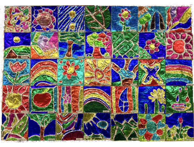The result of this yarn and foil relief project by second graders is artwork that is reminiscent of both stained glass and cloisonné. The yarn provides 3D line designs while the colored foil provides an overall sheen.