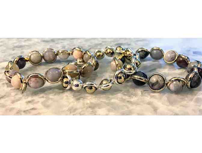 Selected specifically for the SLS silent auction, the winner receives these beautiful beaded bracelets designed by Brett Lauren jewelry. Faceted pink agate in 14 gold plate bezels, smooth leaf agate in 14k gold plate bezels and gold beads in silver bezels.