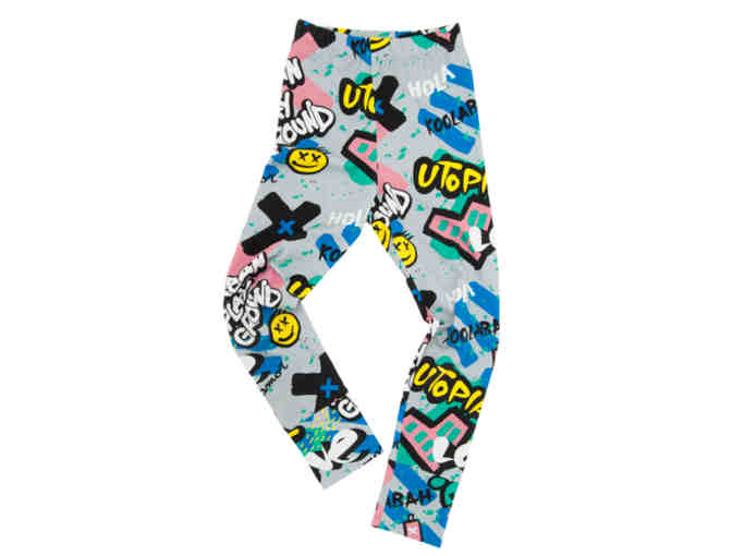 Essential pull-on style leggings, elastic waistband and rib cuffs. Color: grey background with yellow, green, pink, blue, black and white. Material: 95% organic cotton and 5% elastan.