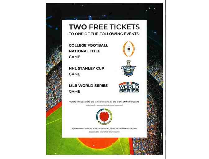 Two Tickets to ONE of the following events: -College Football National Title Game -NHL Stanley Cup Game -MLB World Series Game *Tickets will be sent to the winner in time for the event of their choosing (TICKETS ONLY - does NOT include travel expenses)