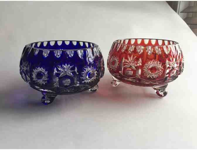 Two vintage Bohemian lead cut crystal footed bowls. Both in excellent condition. Beautifully cut Star of David and floral design with 4 legs and scalloped edging. One in ruby and one in cobalt blue. Width 4-1/2" x 3-3/4" high.