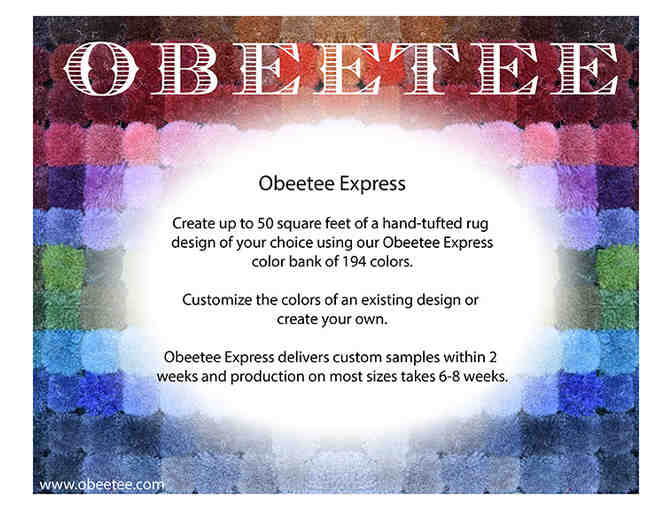 Create a custom rug! 100% NZ wool hand-tufted in India. Winner chooses colors of existing design or creates own from color bank of 194 colors. Winner chooses size (not to exceed 50 sq/ft).