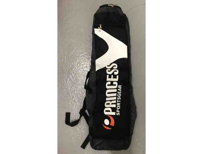 Unused Princess Stick Bag. Top pocket for sticks, smaller pocket for mouth guard, and medium pocket for shoes, shinguards, and clothing.