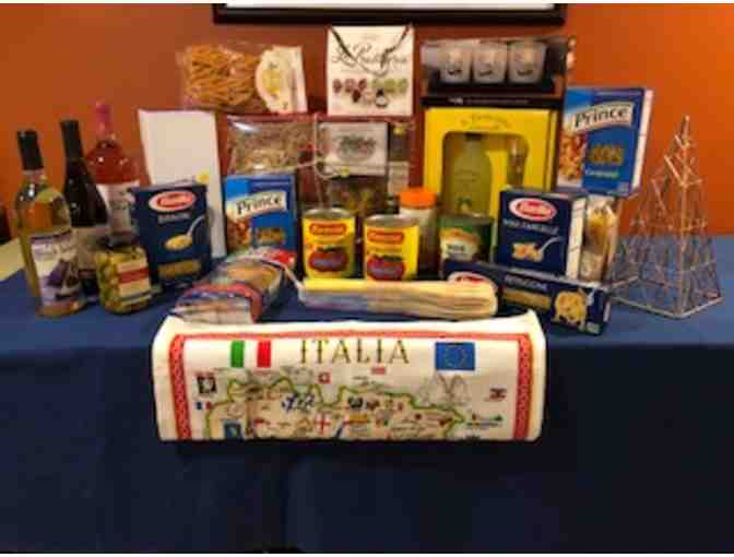 The Italian Basket includes pasta, wooden spoons, diced tomatoes, tomato sauce, olives, cheese, Lemoncello gift package, 3 bottles of wine, Italian cookies, kitchen towel, chocolates, candles, Purple Lemonade