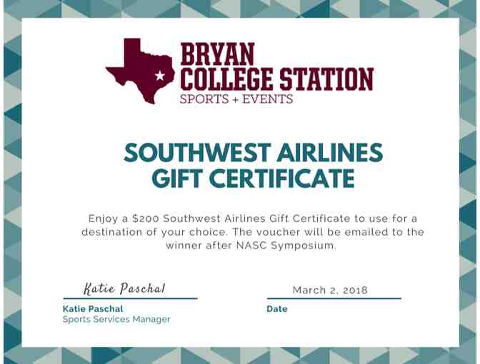 Southwest Airlines gift certificate to use for you chosen destination. The voucher will be emailed to the winner after NASC Symposium.