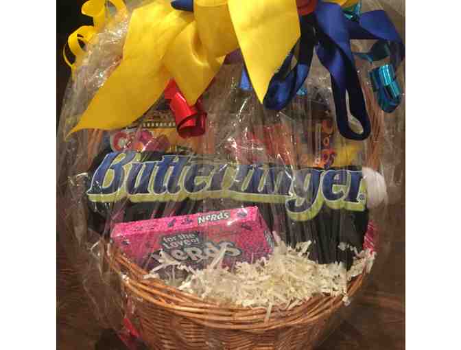 Indulge your kid's candy fix with this gift basket containing a variety of yummy sweet treats from the Nestlé brand, including Butterfingers, 100 Grand, Raisinets, SnoCaps, Crunch, SweeTarts, Spree, Gobstoppers, and more. A Butterfingers t-shirt and small toys are also included. A perfect excuse for a movie night at home!