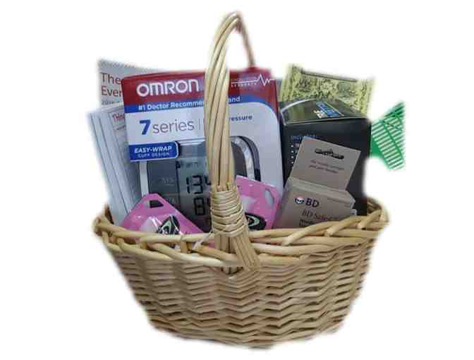 Professional Pharmacy Basket comes with Blood Pressure Monitor, Blood Glucose Monitor, BD Safe Clip, 2 packs of Dex 4 Glucose Gel, and many other items.