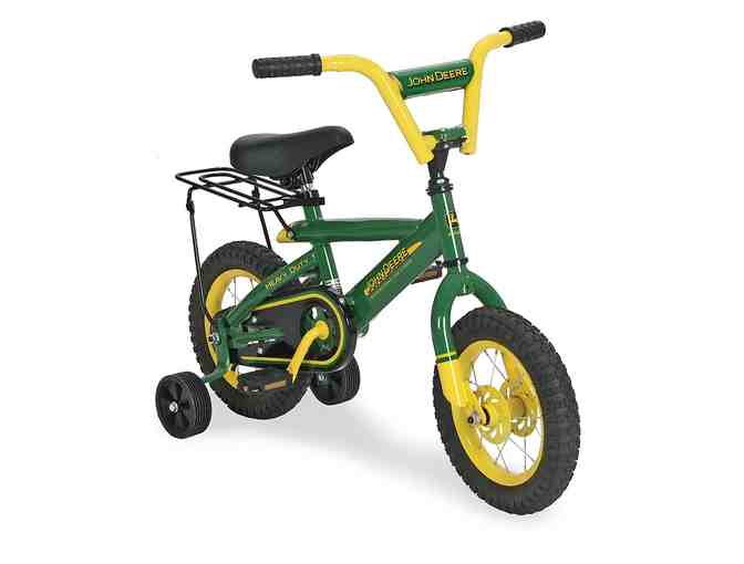 Bring a smile to your child’s face with this new 12” John Deere single-speed green bicycle with black tires. The bike features a heavy-duty steel frame and carry rack for the items you need to take along on the way. This bike also features adjustable training wheels, so it can grow with your child as she learns to ride! (recommended ages 3-5, weight up to 75 lbs.) WARNING: CHOKING HAZARD -- Small parts. Not for children under 3 yrs.