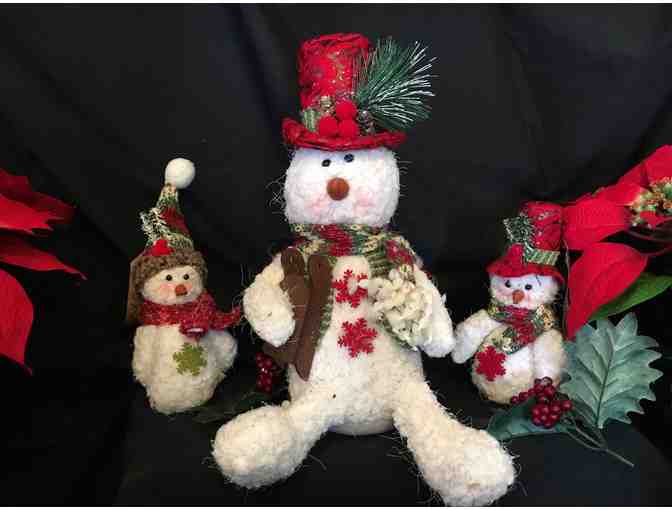 A Snowman Trio from Hann's Handiworks with a shelf sitter (12" high) and Mr. & Mrs. Snowman ornaments (9" high) that work perfectly with the shelf sitter or on a tree. Made from polyester material.
