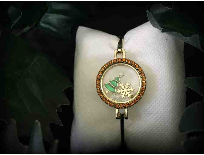 From the 2017 Collection of Alexa's Angels, this clasp closure, gold-toned bracelet with crystals surrounding a enclosure of Christmas memories.