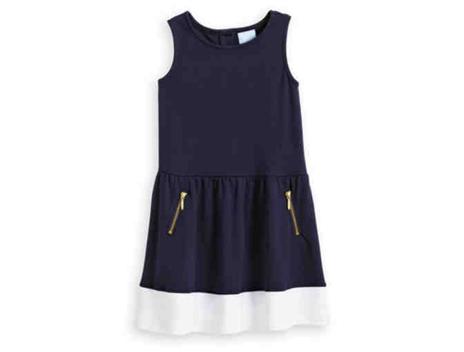 A comfortable scoop neckline and colorblocked hem set this dress apart. You'll love the zipper detail on the front. In Navy/White. 100% cotton; machine wash.