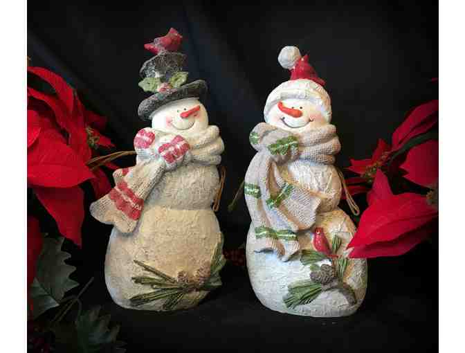 Mr. and Mrs. Snowman, a perfect duo for a side table or mantle. These resin figurines stand 11" high.