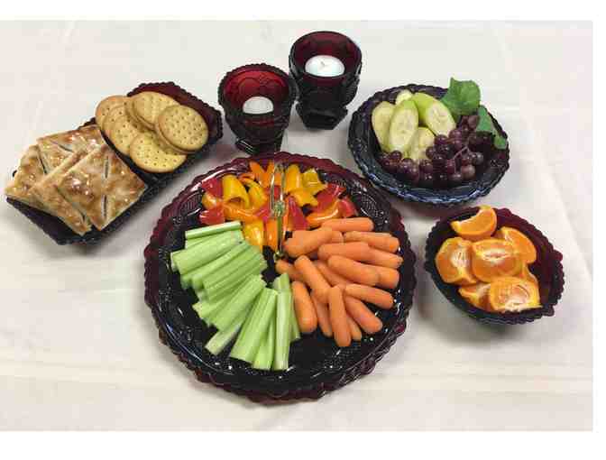 These classic pieces are from Avon’s 1876 Cape Cod Collection, designed by Wheaton Glass for the 100th celebration of the signing of the Declaration of Independence. Need something to help you step up your appetizer presentation? You can’t go wrong with this ruby red relish set. For extra impact, you may want to purchase them in combination with the “Dinner for Two” or “After Dinner . . . Dessert” auction items also listed in this event.