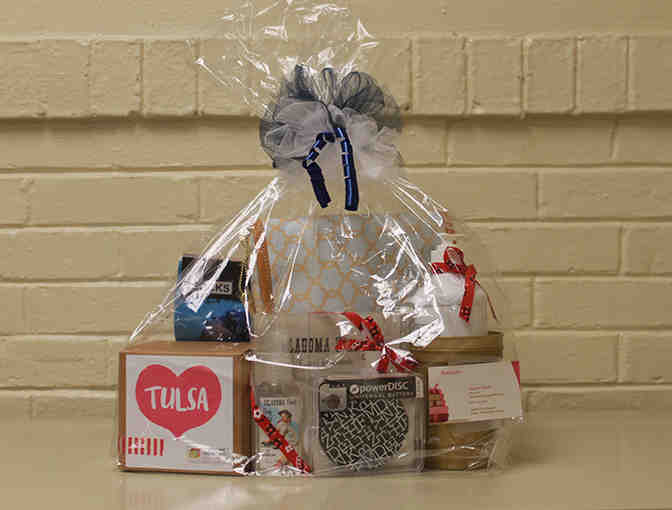 Tulsa mug, 2 OK cups, bubble bath, portable phone charger, lotion/bath set, socks, and crossbody bag