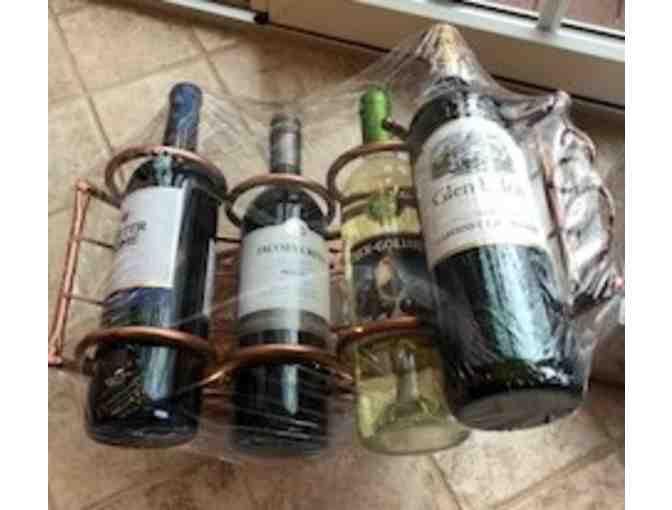 This item includes a wine holder that can hold up to 4 bottles of wine, 1 bottle of Glen Ellen Cabernet Sauvignon, 1 bottle of Rex-Goliath Pinot Grigio, 1 bottle of Jacob's Creek Merlot, and 1 bottle of Sutter Homes Merlot