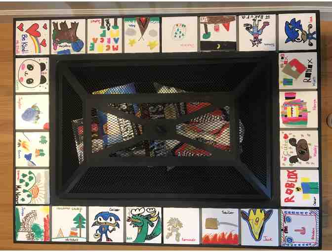 This fire pit is a great way to enjoy an outdoor activity with your family & friends. It is 37" X 28" X 14" ladder frame with ceramic tile surround. The tiles are the individual artwork from the students and teacher of Ms. Elliott's 3rd grade class. The basin of the fire pit is filled with s'mores supplies & marshmallow forks so that you can savor back yard/outdoor activities! Other extra's that come with the fire pit is a fire poker, a mesh top to control sparks, & the original tile pieces.