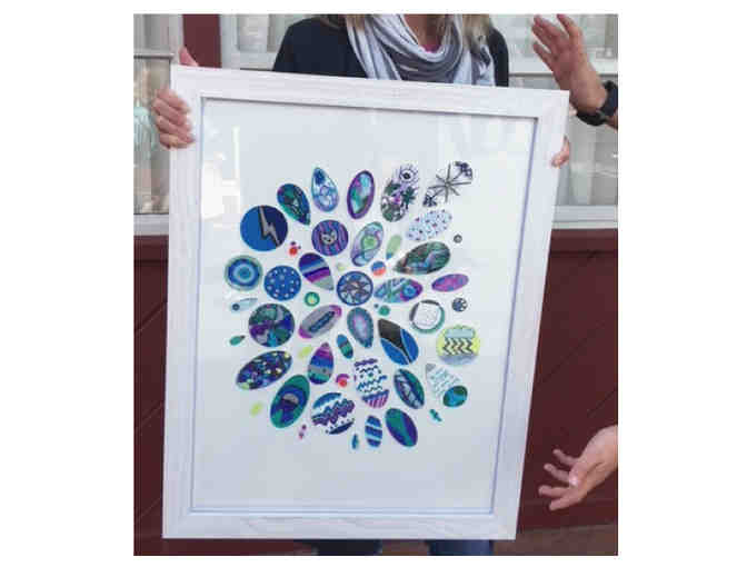 This collaborative collage created by Ms. Turko's 5th grade class will look great in any room. Each student painted a wooden shape in vibrant greens, blues, and purples. The shapes were then artfully arranged to create a one of a kind work of art. Measures 18"x20"