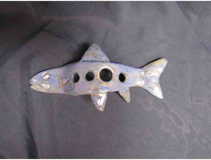 A whimsical pottery fish designed as a fly tying tool holder or caddy that was hand crafted by Mary K The Fish Lady.