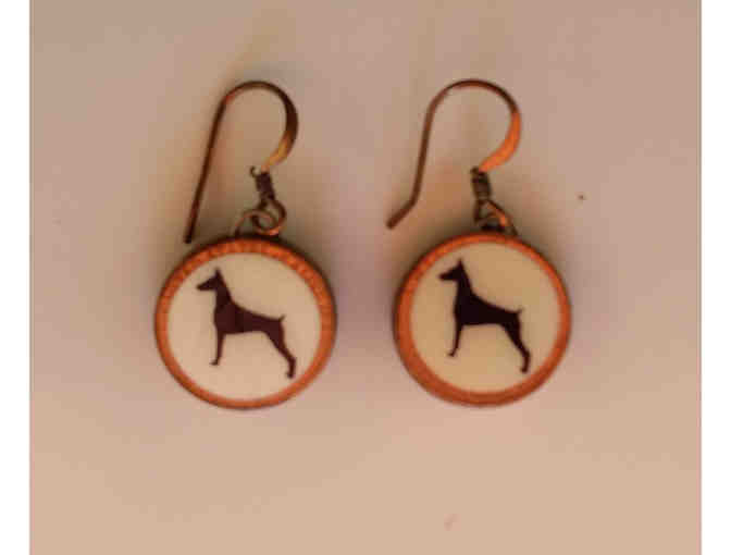 Rather unique Doberman earrings - copper, with white ceramic inserts with a profile of cropped & docked Doberman. The back of earring is a US Penny.