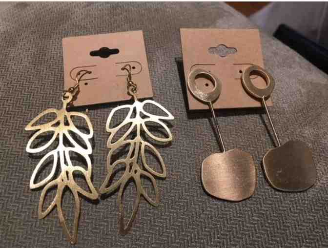 Add either of these earrings to your outfit to take your style up a notch. You get both a leaf longer pair and an abstract dangle circle pair. Keep them both or give one to a friend!