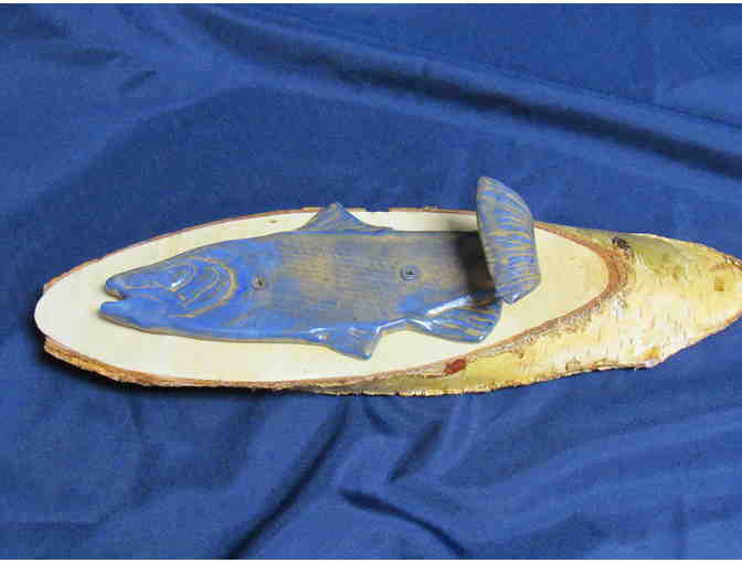 A whimsical pottery and wood fish hand crafted by Mary K The Fish Lady.