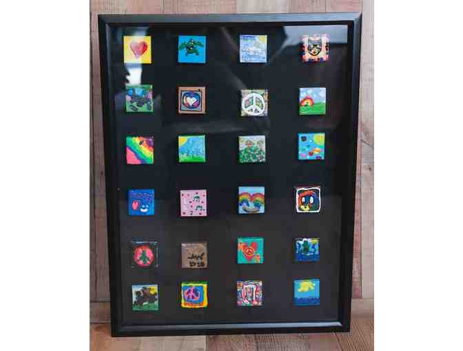 This wonderful grouping of small canvases was designed and painted by the students in RMCS' Guadalupe classroom. They are placed together in an elegant black frame so that you can display them anywhere.