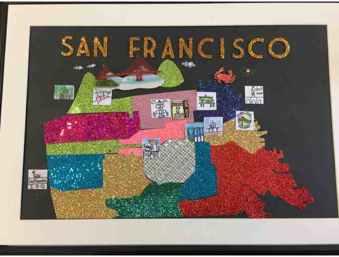 This is a 13 X 9 framed print of San Francisco divided geographically into its neighborhood districts. Each child has chosen a landmark to add onto the map.
