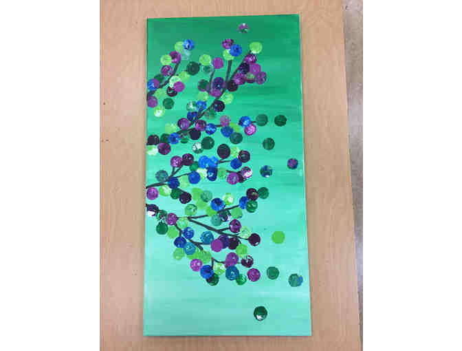 Each of the 12"" x 24"" canvas panels is beautifully painted with either a warm or a cool color palette. Kinder-artists stamped the leaves on the Friendship Tree with acrylics using wine corks. Each of these panels can stand alone to add a splash of color to any room decor.