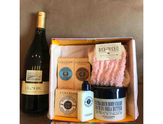 Gift box of L'Occitane products including Ultra Rich Shea Butter Cream, Shower Cream, Extra-Gentle Milk Soap, Hand Cream and Foot Cream, coupled with a pair of cozy socks and a bottle of J. Lohr wine.