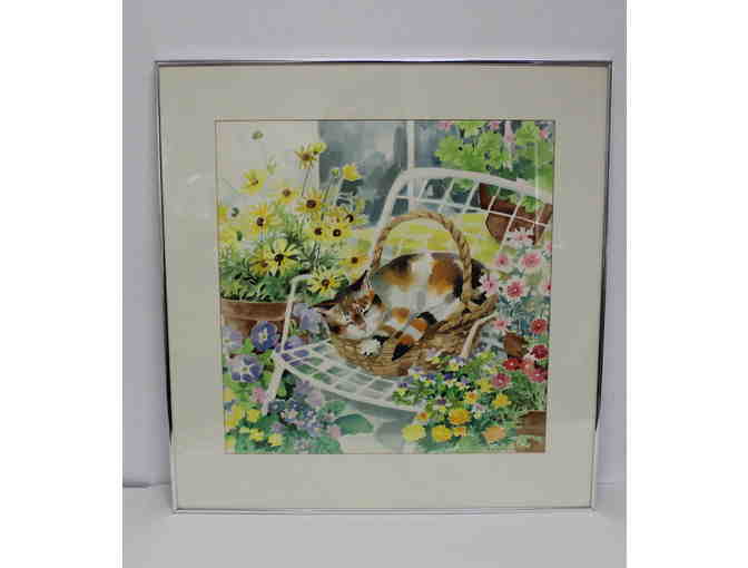 Beautiful framed watercolor of a sleeping calico cat in a basket surrounded by flowers. Framed it measures 24" x 25.5".