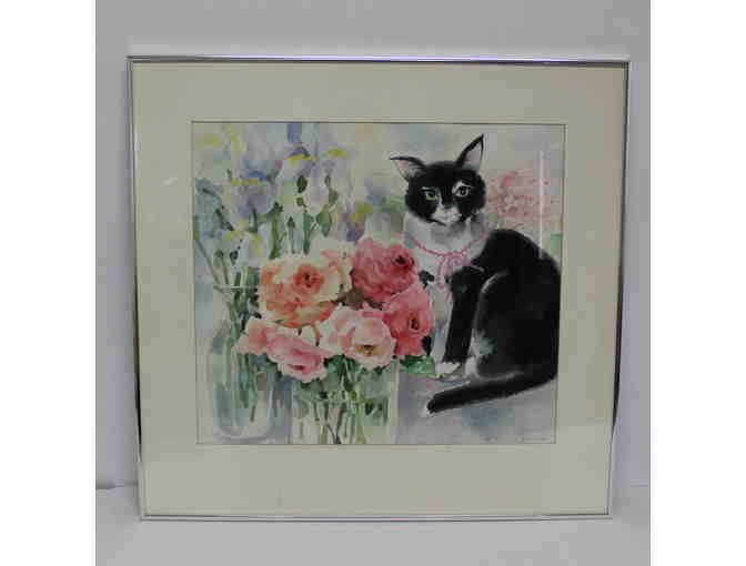 Beautiful watercolor painting of a black and white cat with vases of flowers. Framed it measures 24" x 23.5".