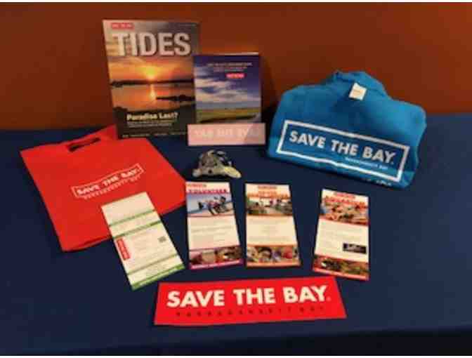 Gift bag includes Save the Bay Uncommon Guide; Adult T-Shirt with Logo; Family Membership; Tides Magazine; Reusable Tote; Mini Plush Harbor Seal with Clip